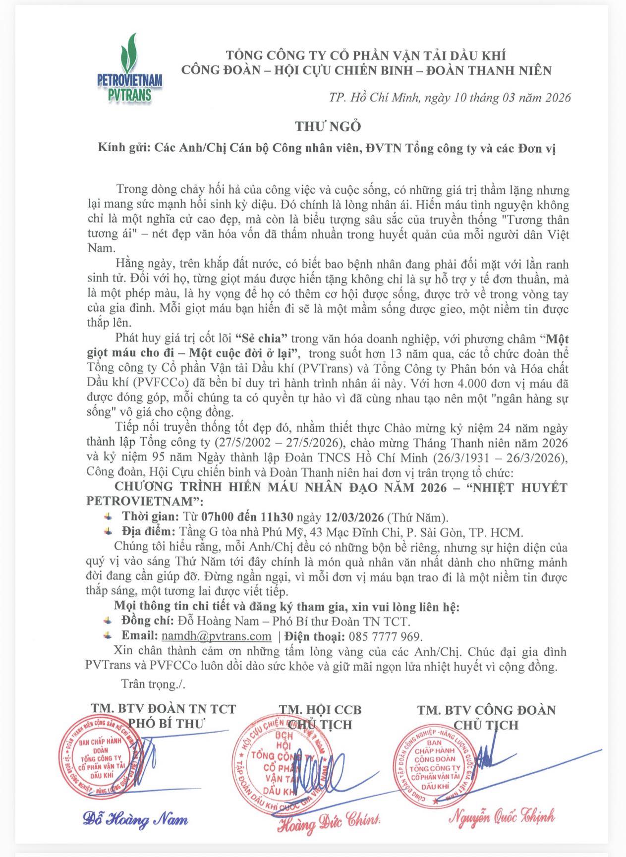 Nhằm tiếp nối hành trình nhân ái vì cộng đồng, Công đoàn, Đoàn Thanh niên, Hội Cựu chiến binh PVTrans phối hợp cùng Công đoàn, Đoàn Thanh niên, Hội Cựu chiến binh PVFCCo tổ chức chương trình Hiến máu nhân đạo năm 2026 – “Nhiệt huyết Petrovietnam”.